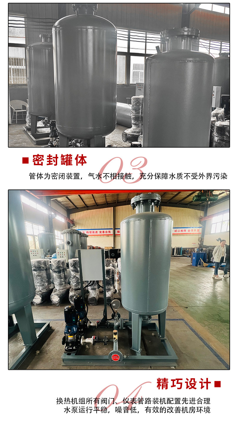 在閉環(huán)系統(tǒng)中,為了確保系統(tǒng)壓力的穩(wěn)定性,需要調(diào)節(jié)的膨脹設(shè)施。當系統(tǒng)壓力降低時,與其連接的壓力罐的水室壓力也降低,空氣室的容積膨脹,壓力也降低。當控制系統(tǒng)設(shè)置下限時,水泵自動打開以補充系統(tǒng),直到達到設(shè)置。設(shè)定壓力上限,泵停止運轉(zhuǎn)。當系統(tǒng)中的水被加熱時,溫度升高,體積膨脹,氣室被擠壓,壓力系統(tǒng)的壓力升高。達到極限值時,系統(tǒng)中的水通過安全釋放裝置進入膨脹機(或軟化水箱)。系統(tǒng)壓力也下降到設(shè)定值并停止壓力釋放。達到定壓補水的作用。